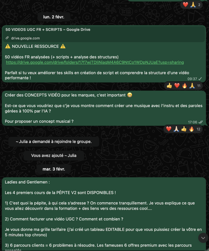 Plusieurs groupes : Ressources UGC, POD Linkedin, Challenges de la Semaine, Opportunités UGC… Le groupe est 100% gratuit et te donne accès à du contenu Premium.